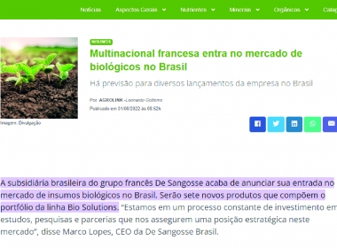 A matéria do Agrolink fala sobre a entrada da empresa no mercado nacional de biológicos.