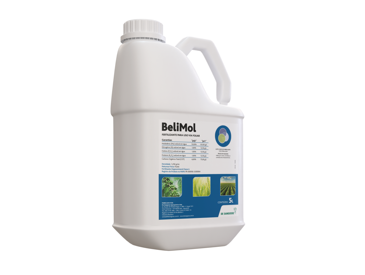 - A formulação de BeliMol possibilita rápida absorção e translocação do nutriente Molibdênio e atua no metabolismo do nitrogênio, melhorando o desenvolvimento vegetativo e reprodutivo.