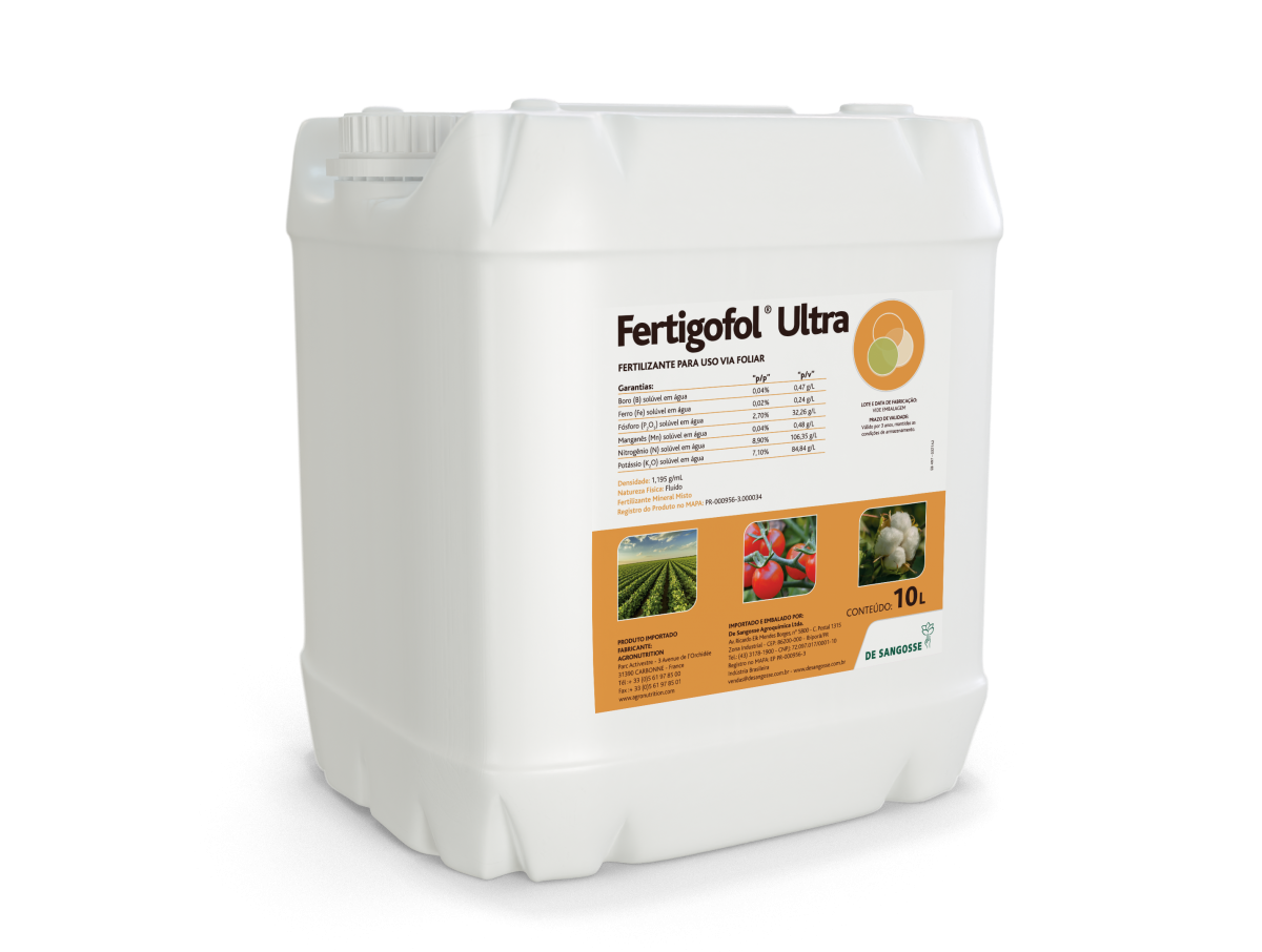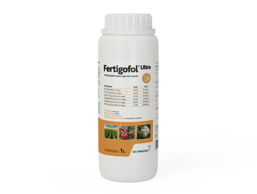Fertigofol Ultra é um fertilizante mineral misto líquido para aplicação via foliar, contendo Nitrogênio, Fósforo, Potássio, Boro, Ferro e Manganês e aminoácidos. A formulação diferenciada de Fertigofol Ultra fornece os nutrientes de forma balanceada prevenindo ou corrigindo deficiências, e auxiliando a recuperação das plantas em condições de estresse.