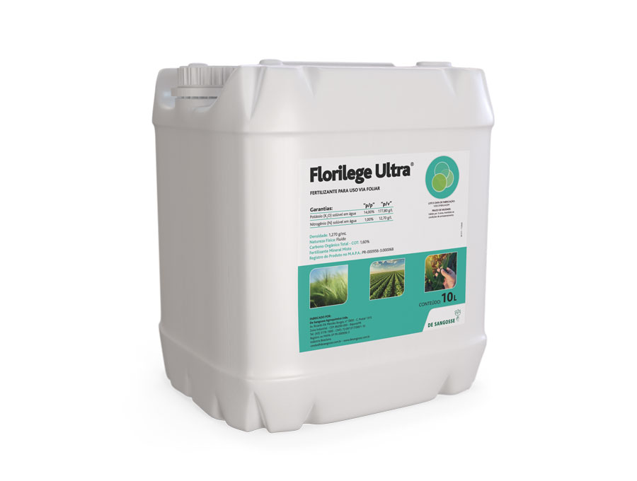 Florilege Ultra é um fertilizante mineral simples líquido para aplicação foliar, contendo Nitrogênio e Potássio para diferentes cultivos, prevenindo ou corrigindo as deficiências destes nutrientes. A formulação diferenciada reúne fosfito de potássio, extratos de algas marinhas e aminoácidos que promovem a resistência das plantas, ajudam na recuperação em situações de estresse e possibilita rápida absorção e translocação do Fósforo e Potássio.